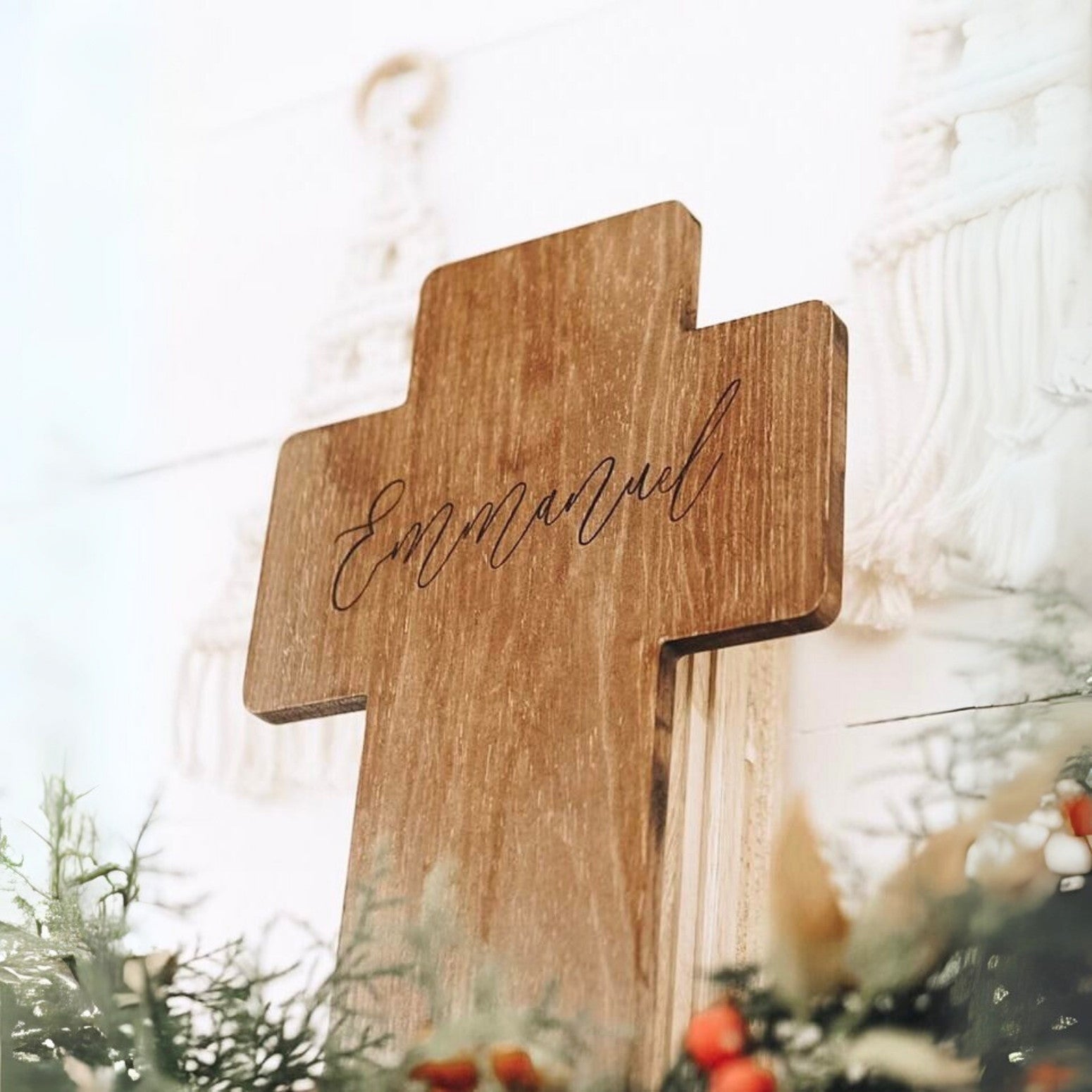 • Features engraved scriptural text with sawdust-filled lettering, giving a rustic, textured finish