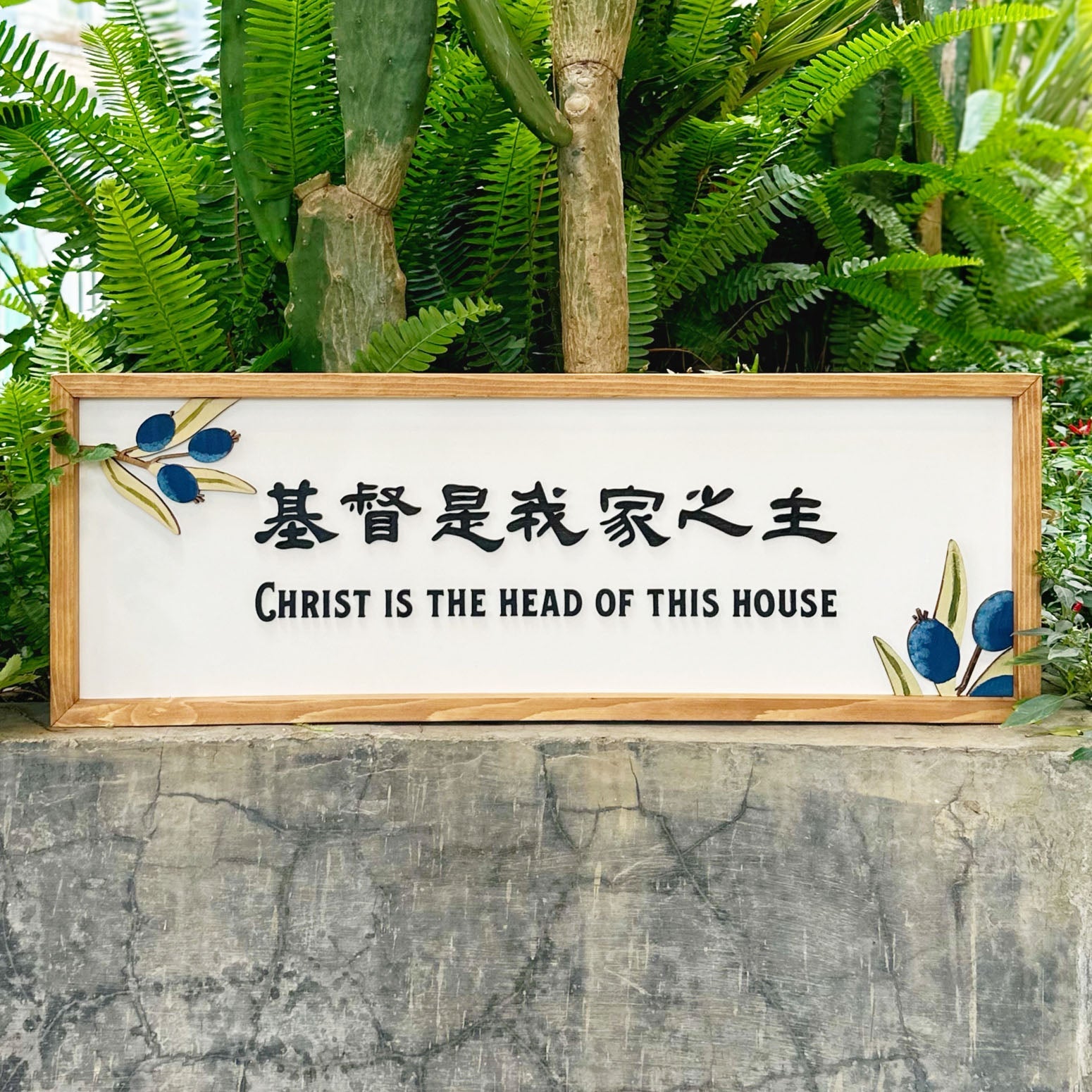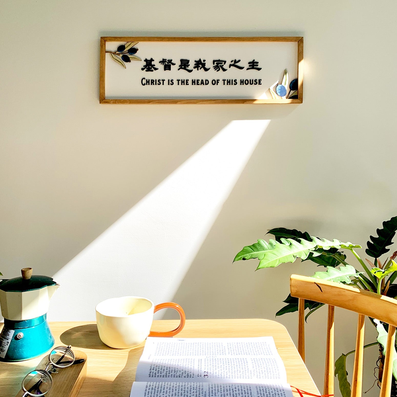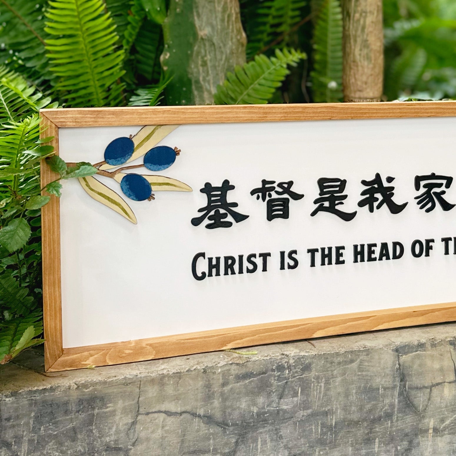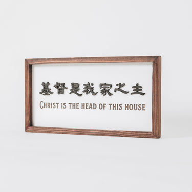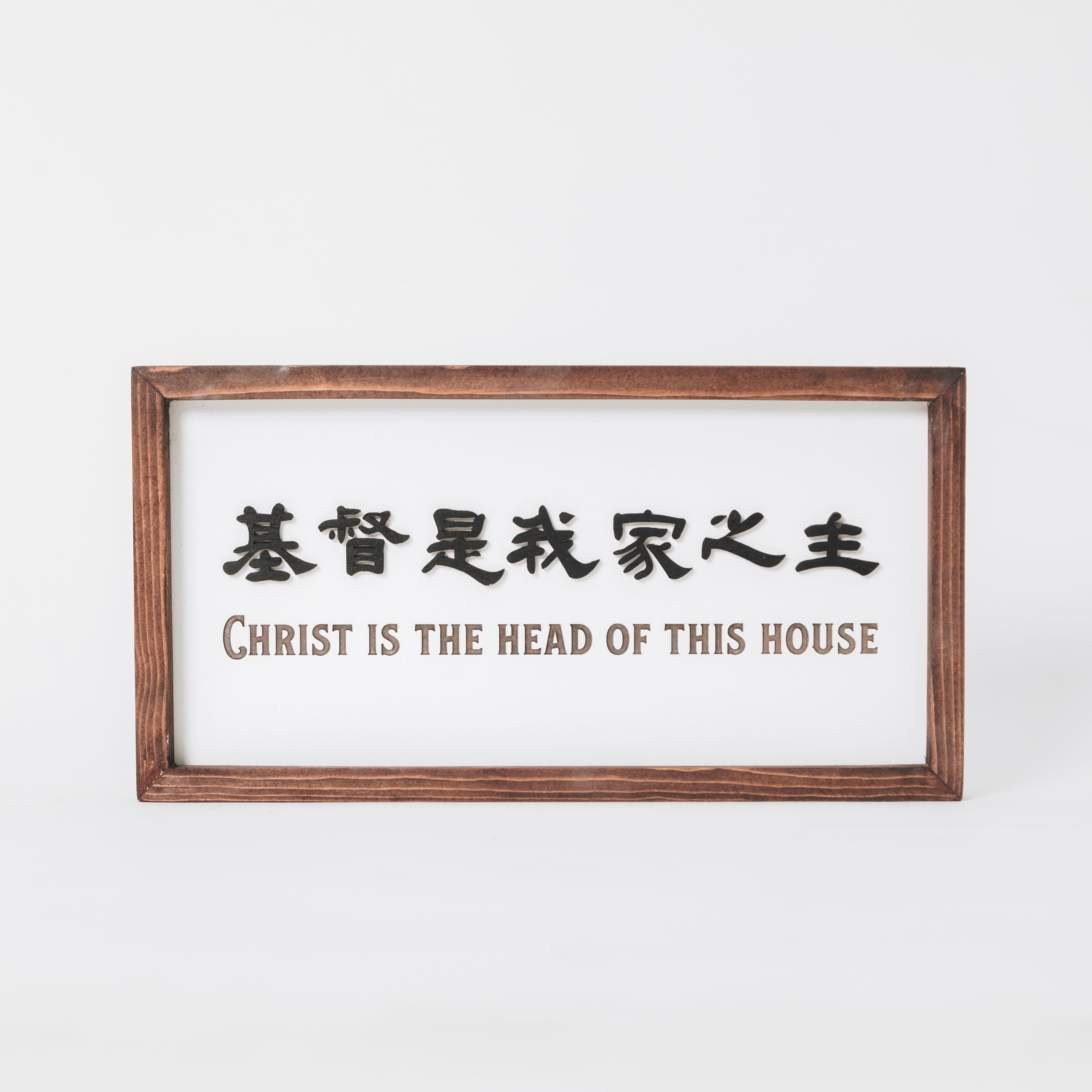 An elegant wooden wall plaque with cut-out Chinese characters, a beautiful daily reminder that Christ is the head of your home.