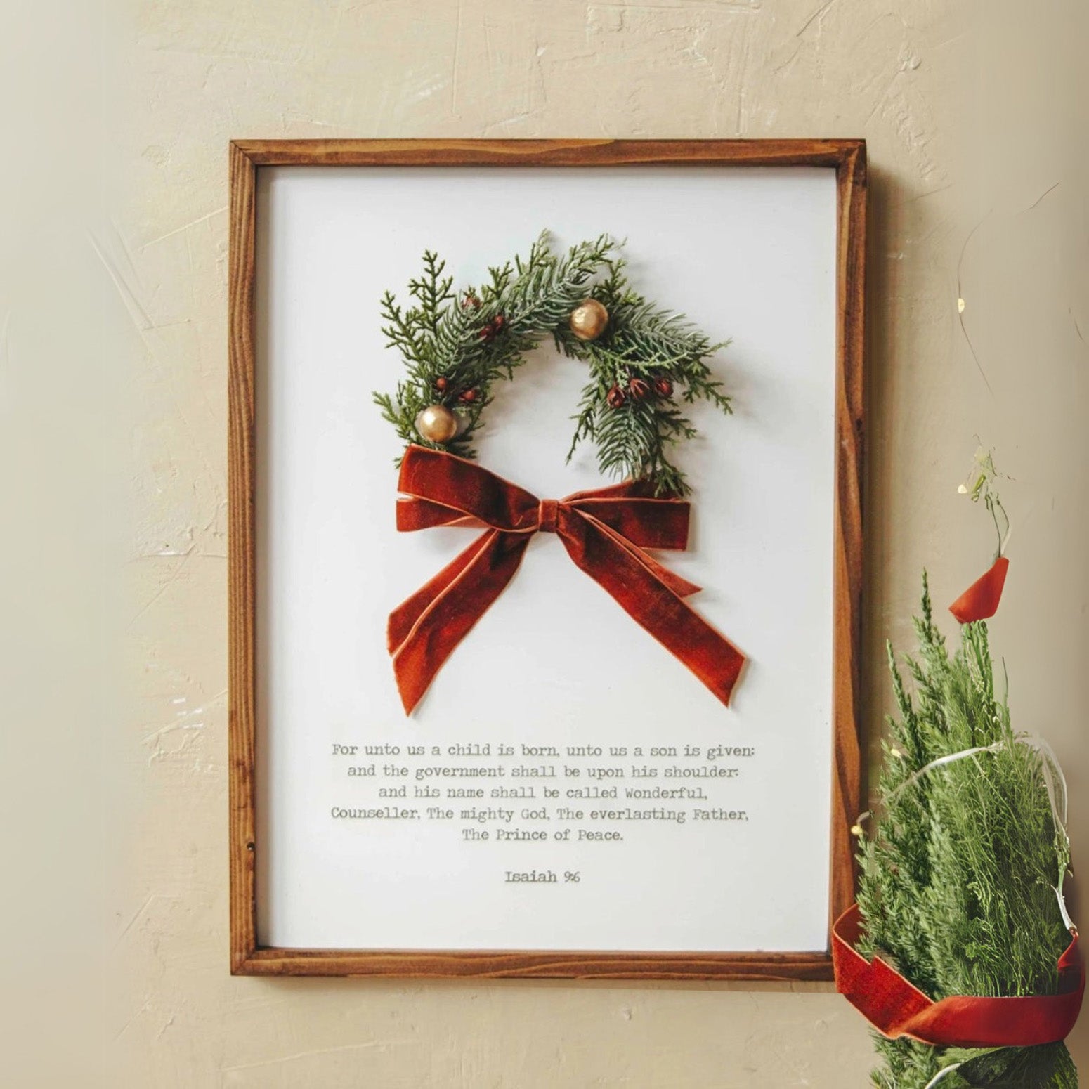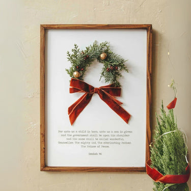 - Adorned with a delicate festive wreath, a velvet ribbon, and hand-painted wooden baubles, all set against a crisp white backdrop for a rich and joyful holiday touch