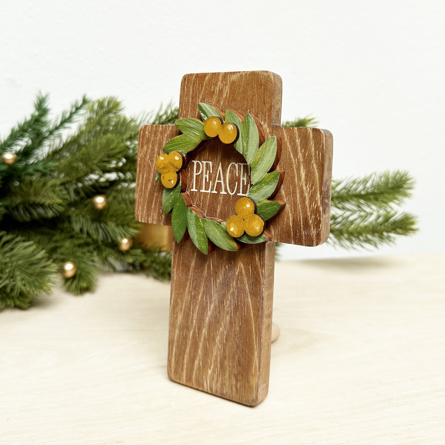 Adorned with a hand-painted wooden cutout wreath