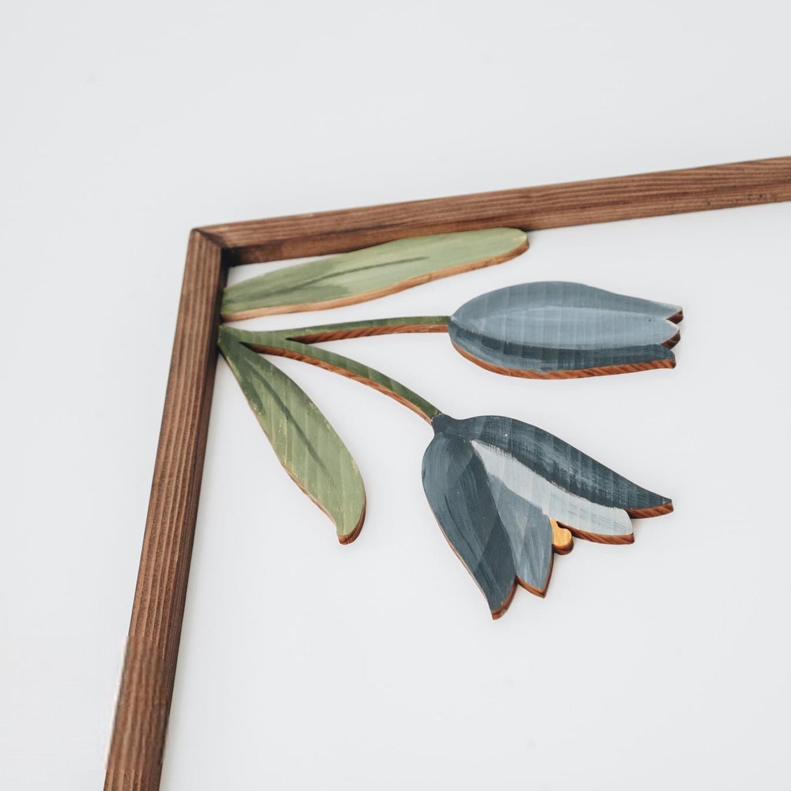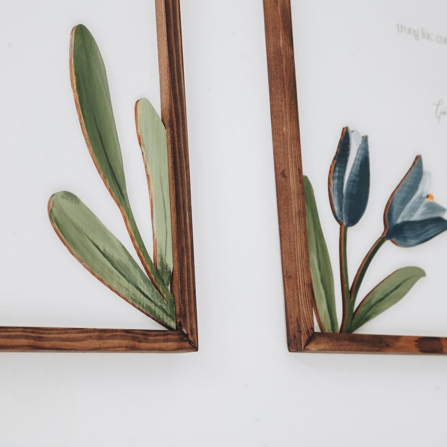- Adorned with delicately hand-painted leaf/flora cutouts in soft, elegant tones