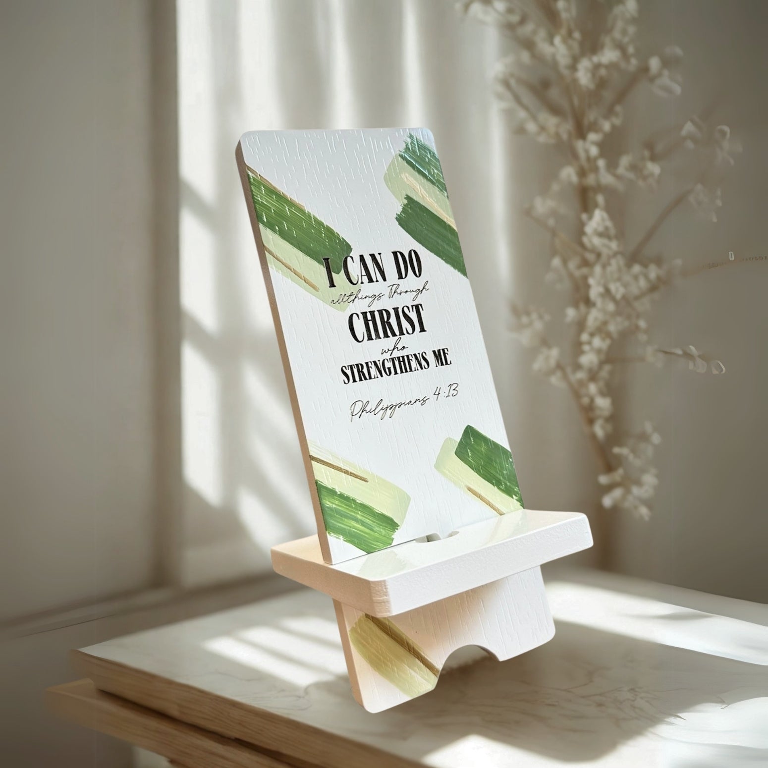 Add a touch of elegance to your desk with this handcrafted phone stand, perfectly angled for effortless viewing and gently reminding you of God’s Word each day.