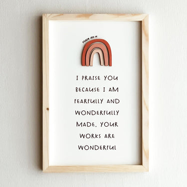A celebration of God’s promise, the Rainbow series is filled with vibrant joy and biblical truth. Featuring hand-painted arches and soft, cheerful tones, each piece serves as a gentle reminder of God's love